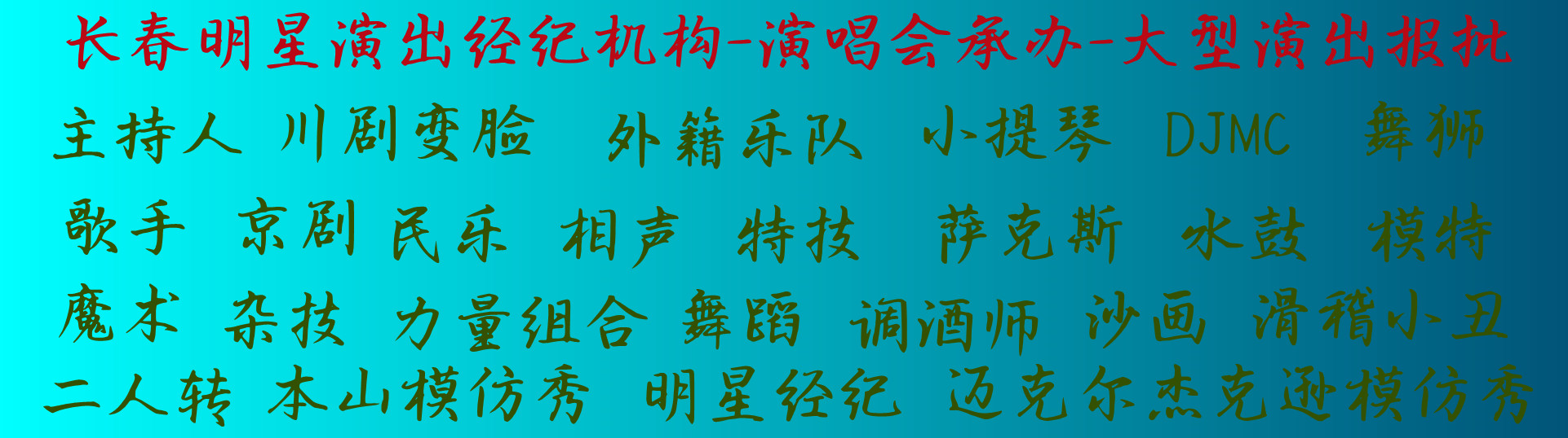 長春演出公司-承接中大型演出策劃執(zhí)行,企業(yè)年會演出,校慶廠慶演出,公司開業(yè)演出,明星經(jīng)紀(jì)演出,晚會,發(fā)布會,答謝會演出,音樂節(jié),啤酒節(jié)演出。MORE